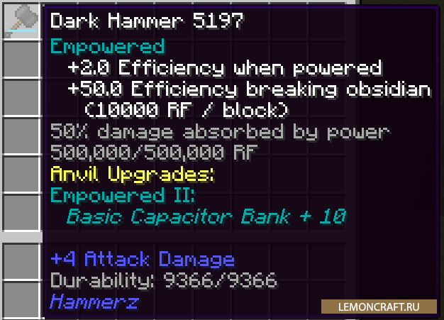 Мод Hammerz добавит в игру новый вид инструмента - молот. С этим инструментом время на разрушение блока значительно сократится. Кроме этого вы сможете производить улучшение вашего молота, что приведет еще к более быстрому разрушению блоков. Данный мод стыкуется с модом Tinkers' Construct.